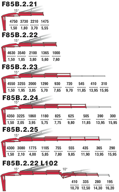 Выпуск нового модельного ряда кранов F85B возможен как в версии F85B.0., то есть традиционно, без траверс (системы рычагов соединения стрел), так и в версии .2. - с ними. Благодаря последним, эпюры грузоподъемности становятся более вертикальными, и кран получает возможность поднимать соответствующий вылету груз практически вертикально, без дополнительного втягивания стрел телескопа.