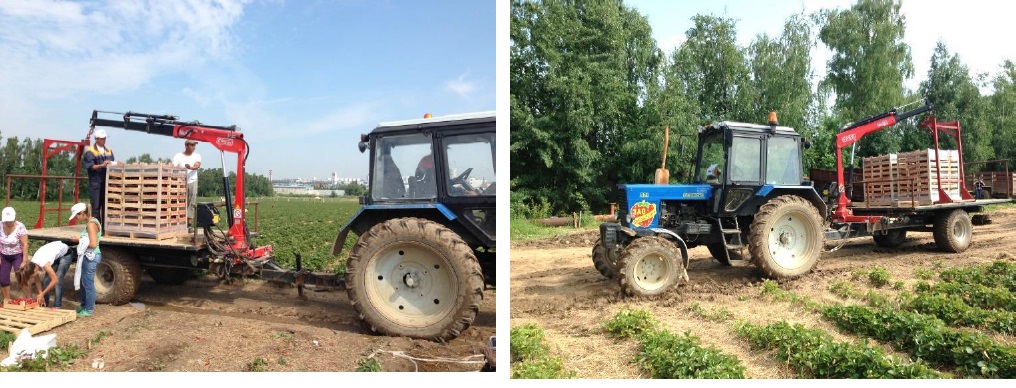 Справится с таким объемом вывоза земляники с поля помогают 6 манипуляторов FASSI M30A13 , установленные на прицепы, с гидрофикацией от трактора. Палеты весят порядка 500 килограмм, основная задача оператора – аккуратно поставить палету на платформу.