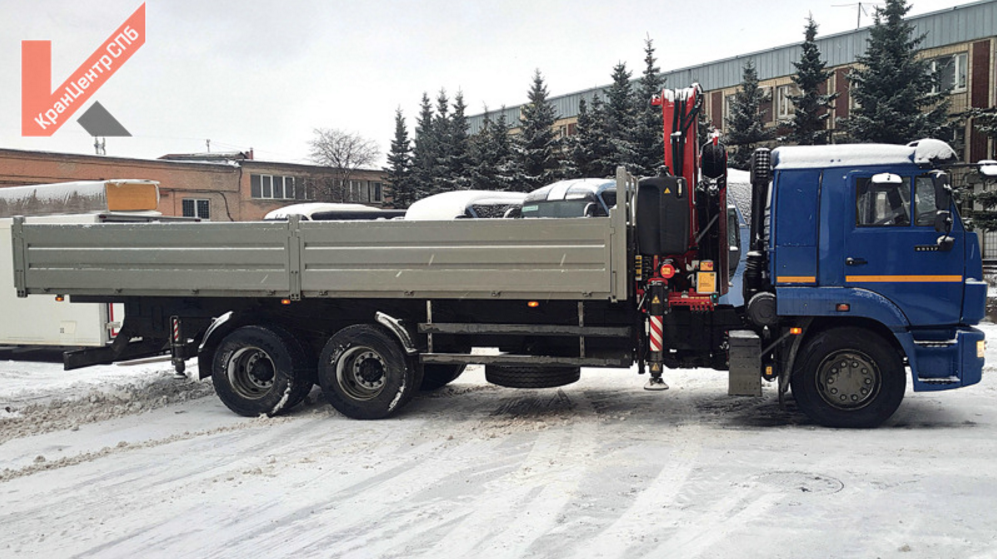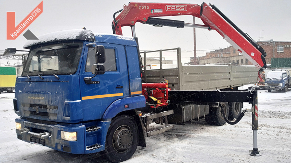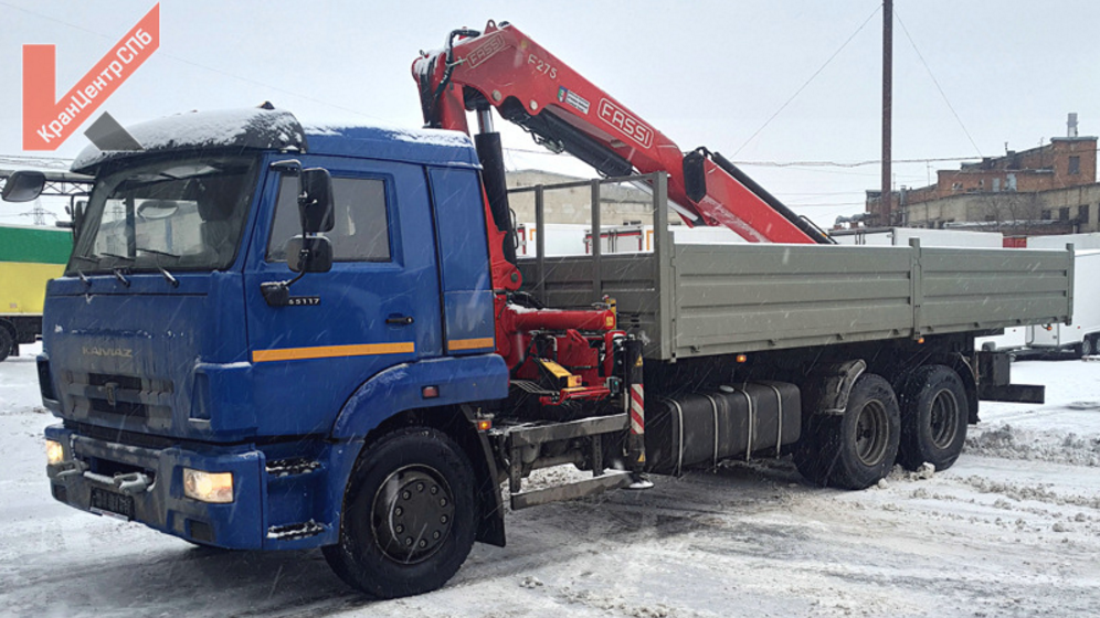 КАМАЗ-65117 с КМУ Fassi F275A.0.22 для перевозки бытовок, генераторов, строительных материалов и оборудования на строительных площадках города Санкт-Петербург