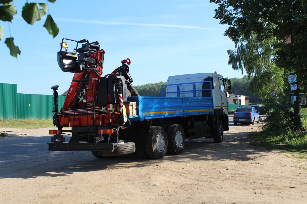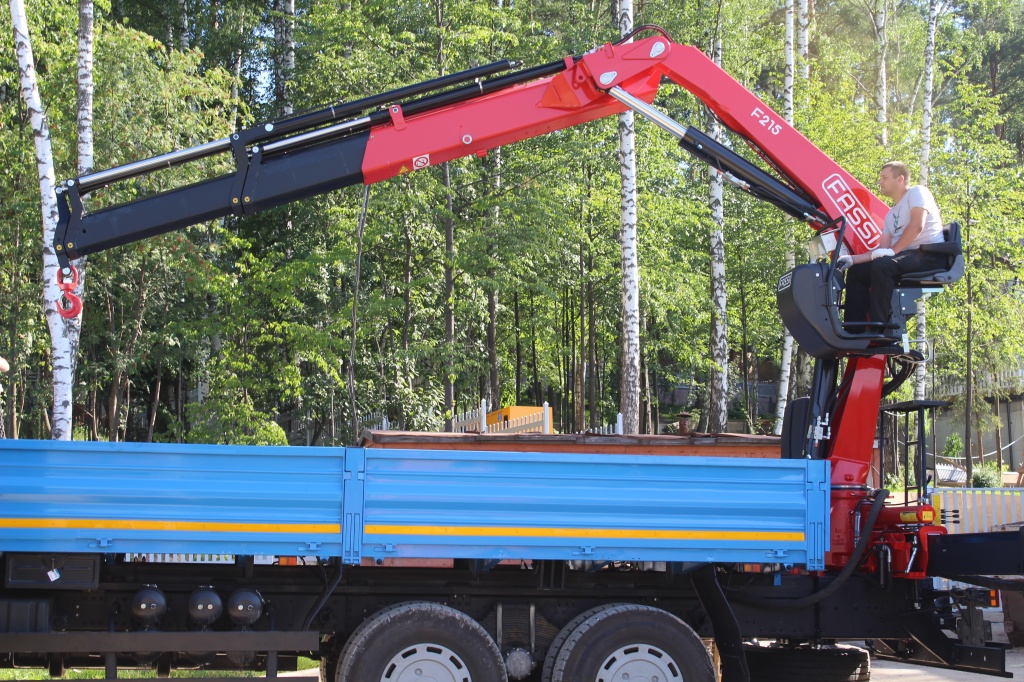 Компактно разместившись на заднем свесе, вплотную к 6-ти метровому борту, кран не только без усилий может загрузить в борт 3х тонную бытовку. Он, легко преодолев рубеж в 12м, заберет груз в 800кг, минуя все преграды, которые не позволяют автомобилю подъехать ближе. Для удобства управления при работе, кран оснастили сиденьем оператора.
