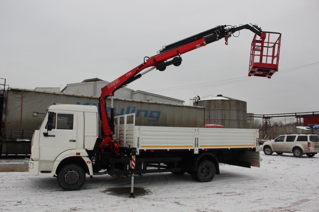 По заказу компании "НижСпецАвто" (г. Нижний Новгород") на два бортовых КАМАЗ 4308 с КМУ Fassi F85B.0.24 были установлены люльки для подъема персонала, с максимальной высотой подъема - более 12м.