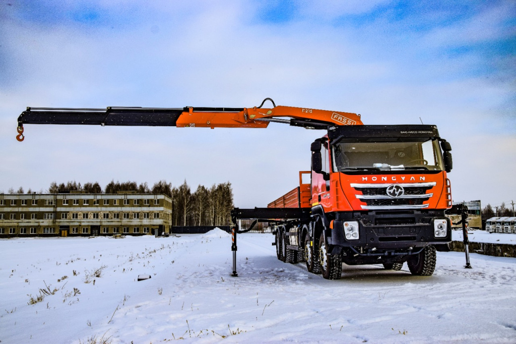 Мощный грузовик, вместительный борт и кран-манипулятор, компактно складывающийся за кабиной, которому многое под силу.