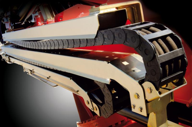 Привод дополнительных функций для гидравлического навесного оборудования или гуська защищен эксклюзивной системой FASSI, состоящей из металлических направляющих с износостойкой цепной транспортерной нейлоновой лентой, что обеспечивает повышенную защиту при работе с ковшем или грейфером.