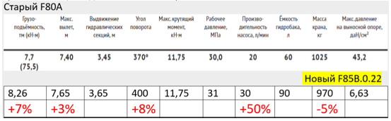 Практически все параметры новой модели значительно превосходят знакомые характеристики F80A. Кран стал мощнее, вылет стрелы длиннее, увеличилась скорость работы, и главное, по весу - установка стала легче!