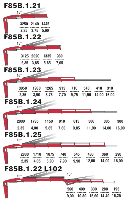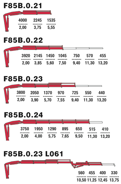 Выпуск нового модельного ряда кранов F85B возможен как в версии F85B.0., то есть традиционно, без траверс (системы рычагов соединения стрел), так и в версии .2. - с ними. Благодаря последним, эпюры грузоподъемности становятся более вертикальными, и кран получает возможность поднимать соответствующий вылету груз практически вертикально, без дополнительного втягивания стрел телескопа.