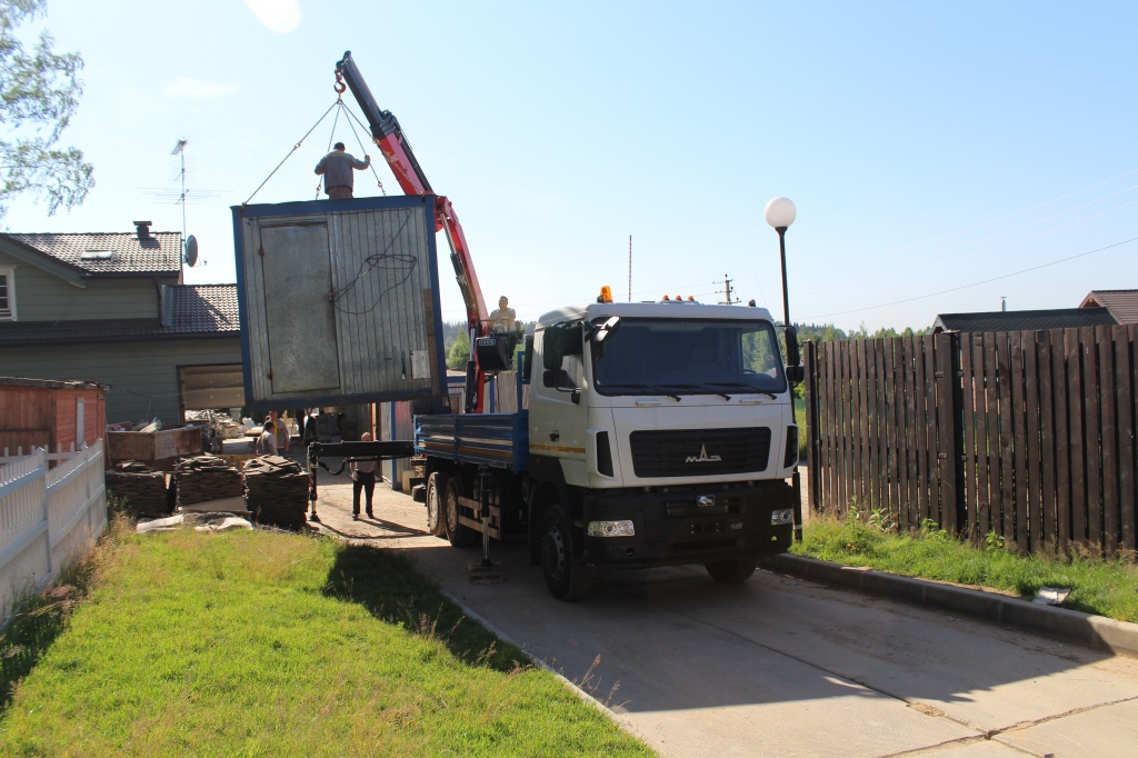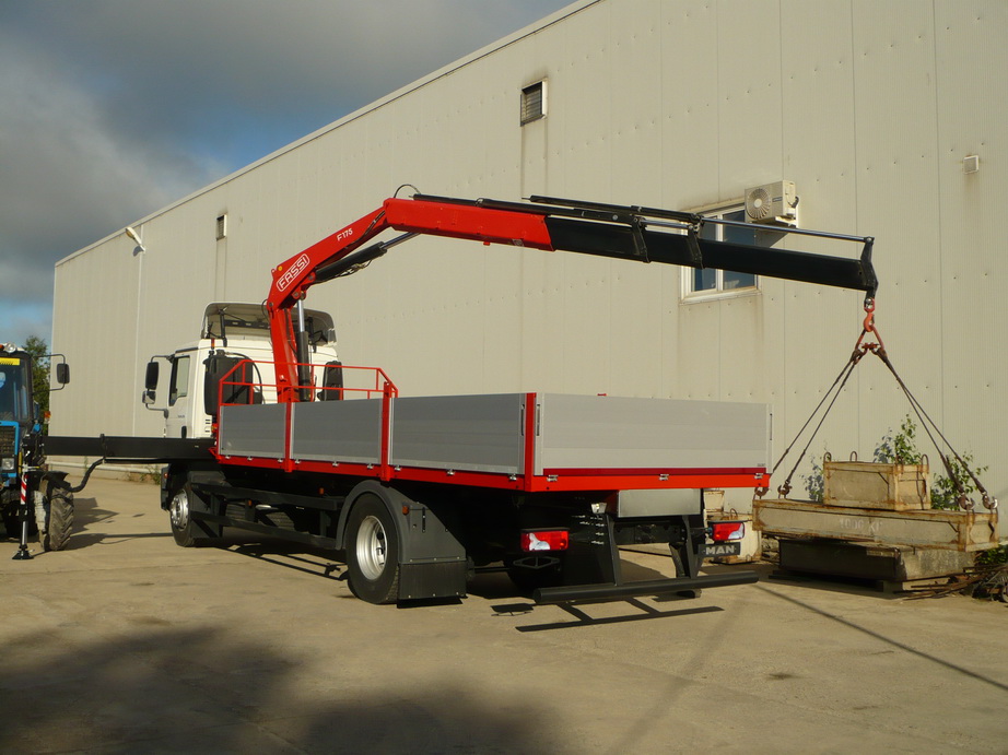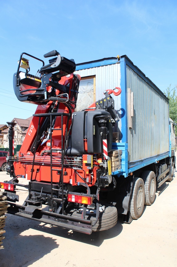 Компактно разместившись на заднем свесе, вплотную к 6-ти метровому борту, кран не только без усилий может загрузить в борт 3х тонную бытовку. Он, легко преодолев рубеж в 12м, заберет груз в 800кг, минуя все преграды, которые не позволяют автомобилю подъехать ближе. Для удобства управления при работе, кран оснастили сиденьем оператора.
