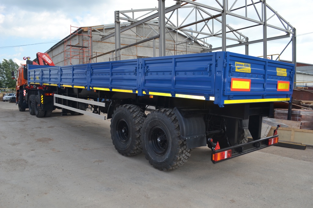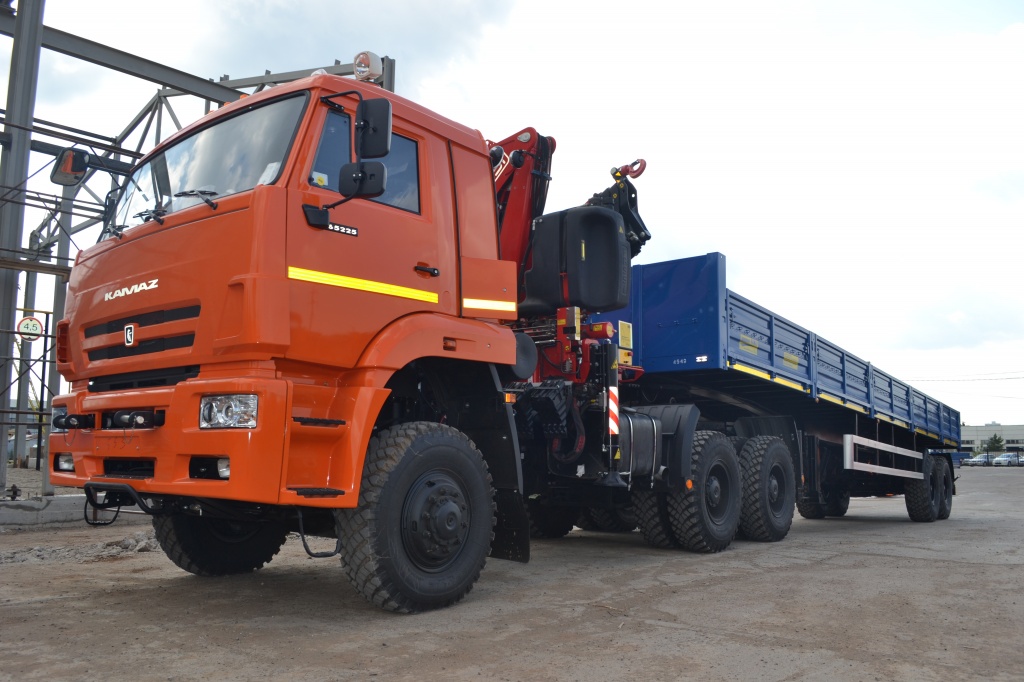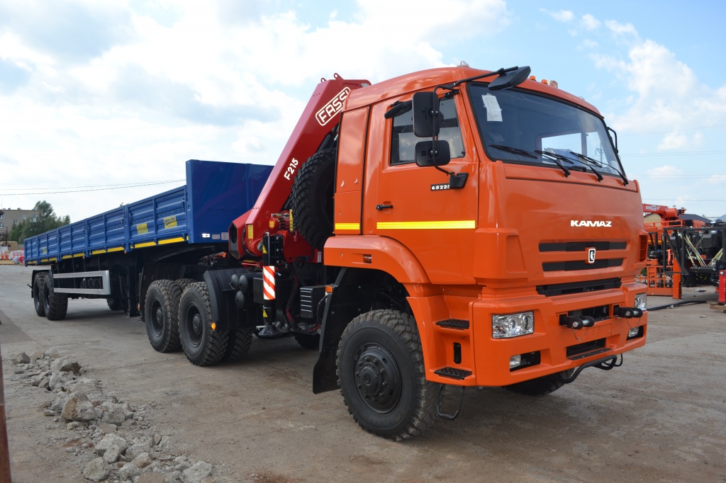Компания “СПМ” (г. Набережные Челны), взяв за основу полноприводный седельный тягач КАМАЗ 65225 и бортовой 12-ти метровый полуприцеп СЗАП-9327 (грузоподъемностью 21т), оснастила тягач «рубином» ☺ из коллекции FASSI, краном F215A.0.24. Имея вылет стрелы в 12,30м, с грузом, более 1,2т, кран способен легко дотянуться до заднего свеса полуприцепа и без усилий разместить груз по всей площади платформы. А на вылете стрелы 2м кран без проблем справится с грузом более 8т.