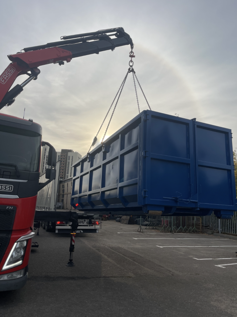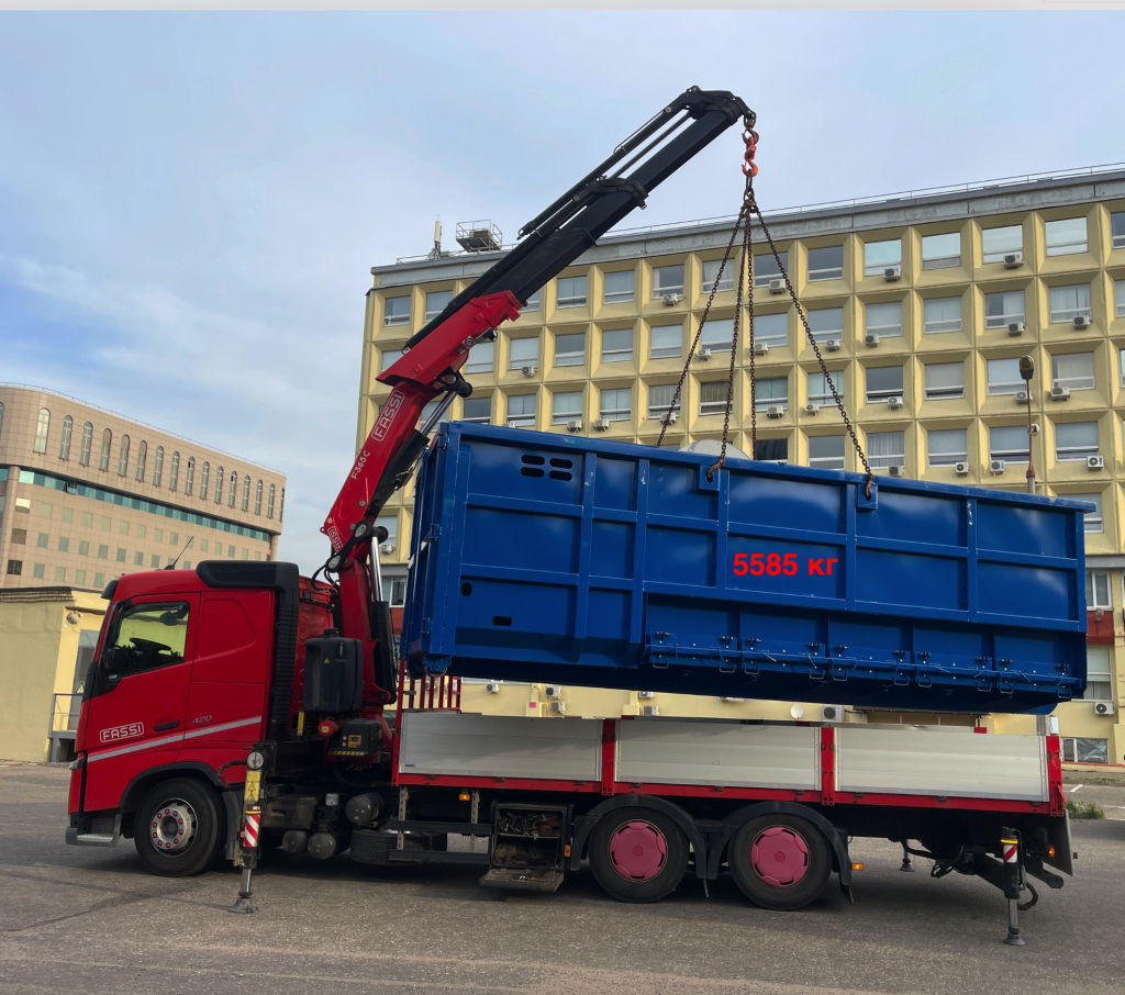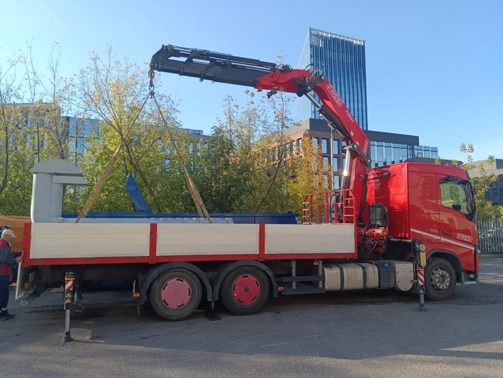 VOLVO с F365AC.2.26 – разгрузка мобильной снегоплавильной установки.